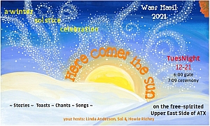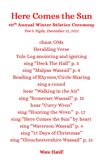 At 7:09pm on December 21, 2021, Sol Richey and myself mounted the Shed Stage of Green Man Coffee House’s backyard theater and bellowed Wæs Hæil! The well-spaced, assembled multitude answered in kind to the Olde English expression for be well— our longstanding toast for this special party. So began the 40th annual Winter Solstice Celebration.