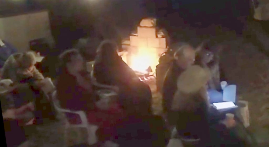 Folks arrived at 6:00 and feasted on their own picnic dinners because we eschewed (pun intended) our normal potluck style. Long about 6:30, I began concocting a pot of wassail, the seasonal hot beverage that truly sets the mood for this unique gathering. I’ve used the same recipe for a long time: ale, sherry, brown sugar, ginger, nutmeg, baked apples, lemons. Lina made a virgin version without alcohol. Just before the ceremony began, Lina and daughter Julia passed out compostable cups of the drink. Attendees also held songbooks and ceremonial orders.