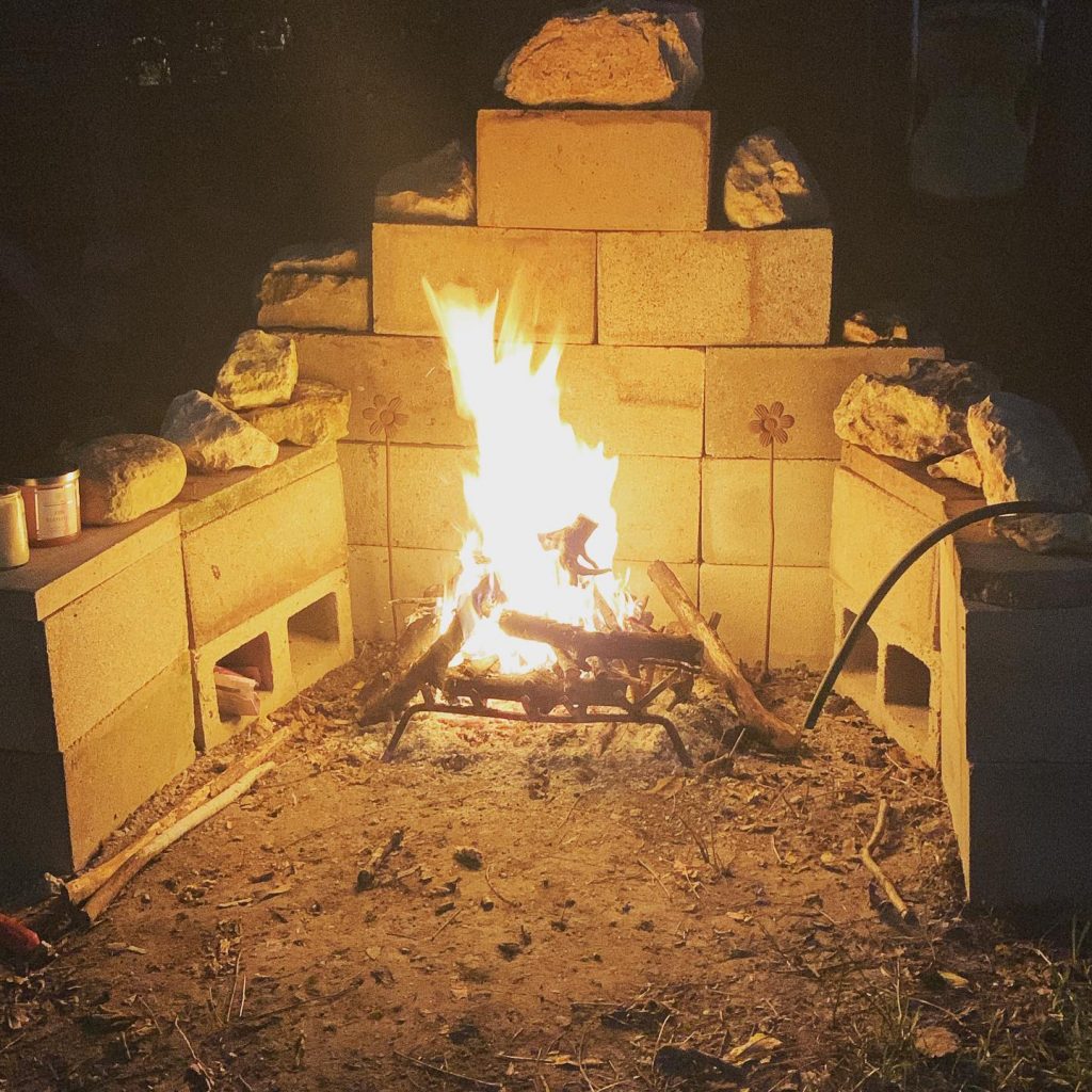 But where? Sure enough, it so happened that an adequate venue awaited with immediate availability: our very own Green Man Coffee House pavilion, back yard theater, and Shed Stage, scene of many gatherings since 2009, but never a Winter Solstice. Traditionally, the bonfire that helps the Sun return from his southward journey is brought inside the dwelling on the longest night of the year. Texas winters are often mild, and luck brought no rain to the forecast this particular evening. Under current circumstances, instead of a hearth that you’d find inside a great hall, we arranged standard concrete blocks in an unusual way to build an elegant place for the fire.