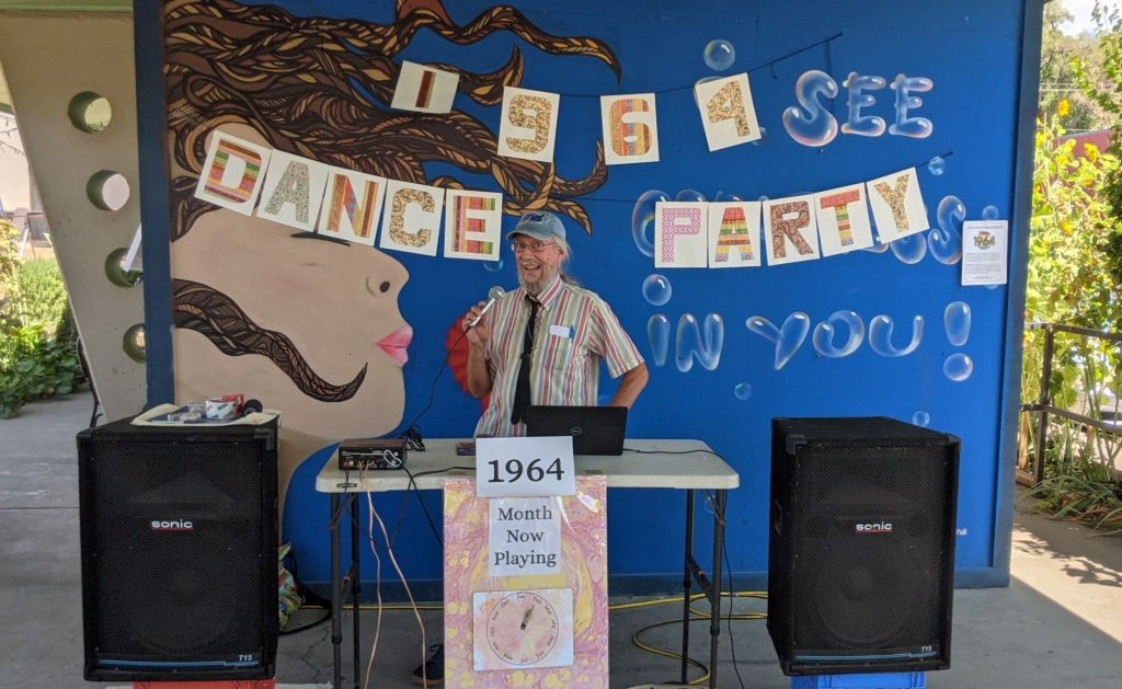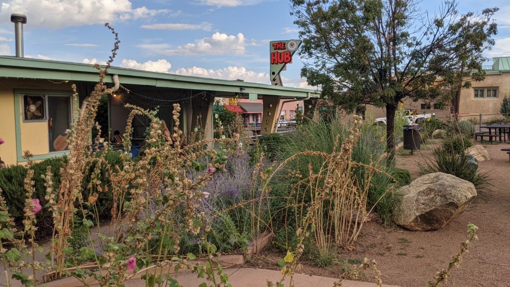 We set up on the town’s main drag, Bullard, where it intersects 6th Street, at The Hub, originally an automobile dealership. In its southeast corner stands a plaza with a substantial roof and massive supports, but no walls. That open-airiness allowed passersby to catch notes emanating from the dance floor. My tiny Pyle amp drove two 15″ PA speakers, borrowed from KURU. On my laptop I queued the 167-song playlist. A lone vendor offered Star Wars Lego characters for sale. Stand-up tables flank the south and east edges, and sit-down benches frame the west. Beyond them stretches an expanse of gravel and boulders with picnic tables. Hub businesses include Mint Chip Creamery, Forrest’s Pizza, Diane’s Bakery, and Power & Light Press, where Linda first taught bookbinding for poets in 2022. Silver City Food Co-op sits catty-corner from there, and radio station KURU’s north windows look directly at the plaza across 6th.