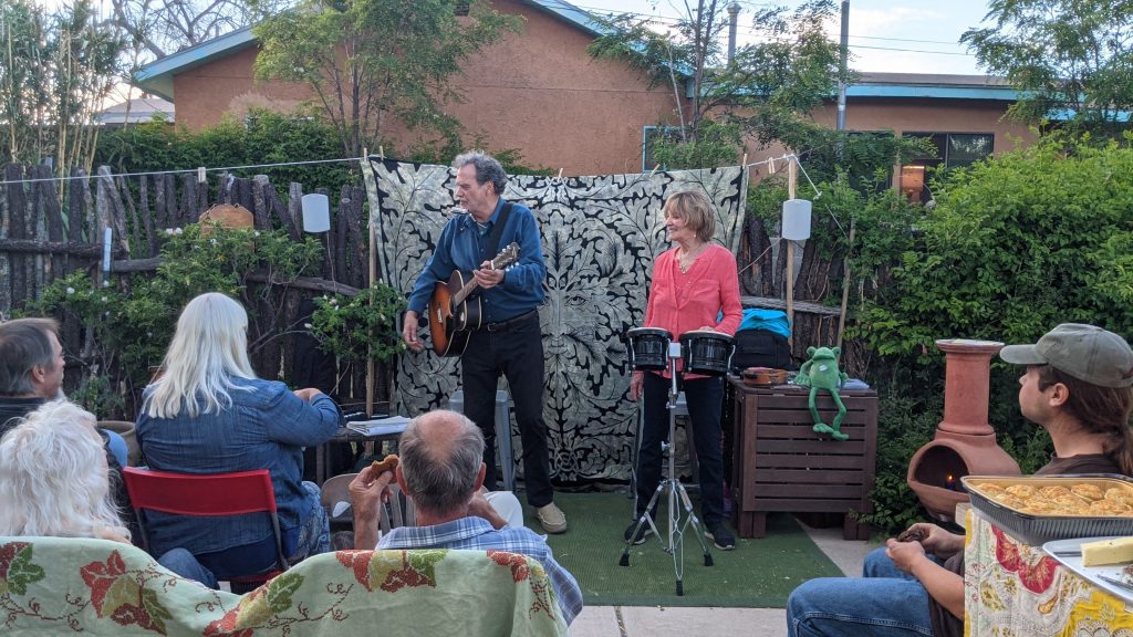 Every chair found an occupant as the audience spilled out into the yard’s cozy corners. Attending were local musicians and poets, neighbors, radio personalities, the Heart of the Gila foundation director, assorted Kerrverts, and a fast friend from Socorro. Bill and Virginia performed most of their environs-oriented greatest hits, such as “Muir Power To You” and “Turtle Island.” In between, selected participants stood up and shared other tunes, like the “Gila River Song,” which reinforced the evening’s regional eco-ethos theme. Abundant potluck offerings came tasty and varied.