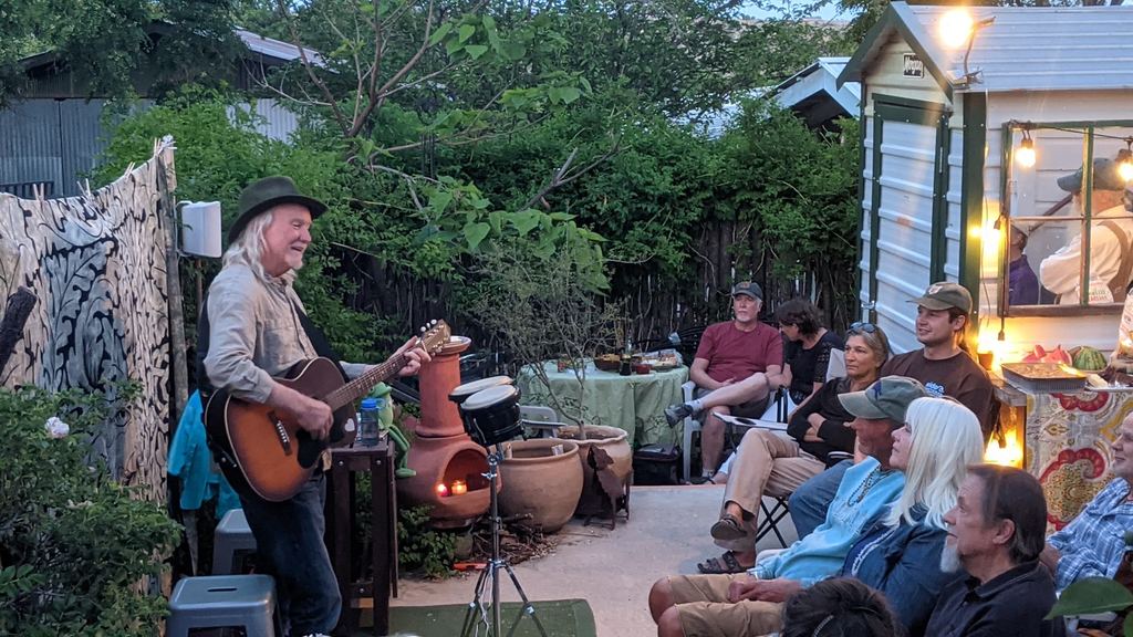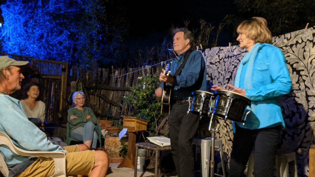Our first house concert after officially moving to Silver City took place on Wednesday, May 15, 2024. The newly dedicated Garden Salon displayed our reworked logo and mascot, Stumpy. Special guests were Virginia Palmer and Bill Oliver, two mainstays of Austin’s Otter Space Band. Their Never Say You’re from Texas Tour had tickled eardrums in a Las Cruces coffee house and at a 40-year environmental musician reunion in Arizona’s Cave Creek Canyon before wrapping up with a stop here.