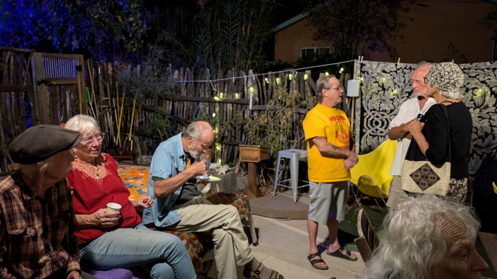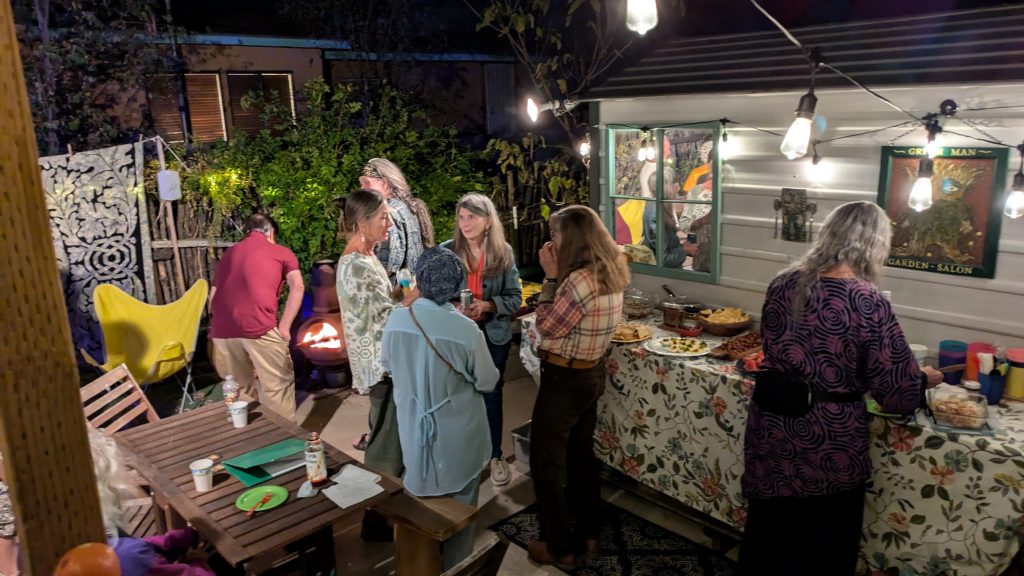 And the seasons, they go round and round, and the falling leaves turn golden and brown. Many joined us at 7:09 directly after First Friday, October 4, in our cozy hillside enclosure for an evening of merriment and conviviality. We featured music of the earth and harvest time. New also came a darkened version of Stumpy, our Garden Salon totem. Abundant were potluck munchies or bevvies as well as poems or songs performed.